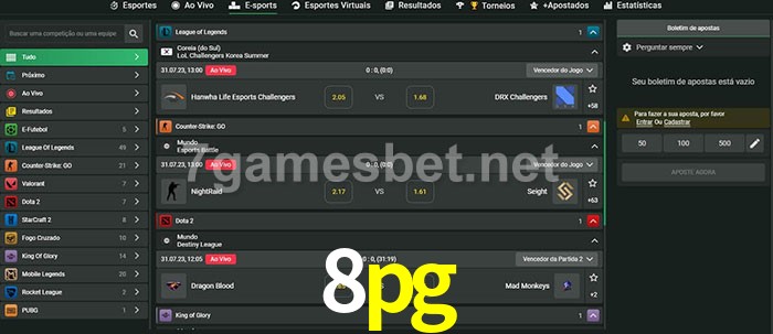 O 8pg oferece uma grande seleção de opções de apostas em e-sports com probabilidades competitivas